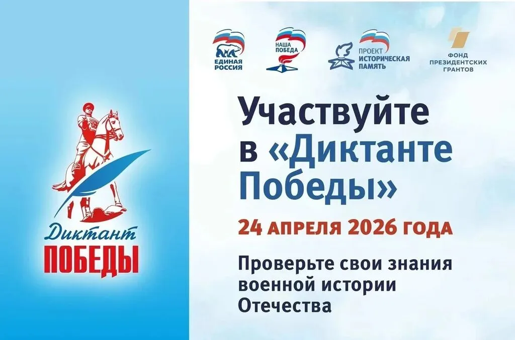 24 апреля в Межпоселенческой библиотеке состоится международная историко-патриотическая акция «Диктант Победы». В 2026 году мероприятие будет посвящено 85-летию начала Великой Отечественной войны, 130-летию со дня рождения выдающегося полководца, маршала Советского Союза Георгия Константиновича Жукова, и другим значимым советским военачальникам. Особое внимание будет уделено юбилейным датам ключевых событий Великой Отечественной войны, которые будут отмечаться в следующем году. В рамках акции также будет представлен отдельный блок заданий, посвящённый героям Специальной военной операции.