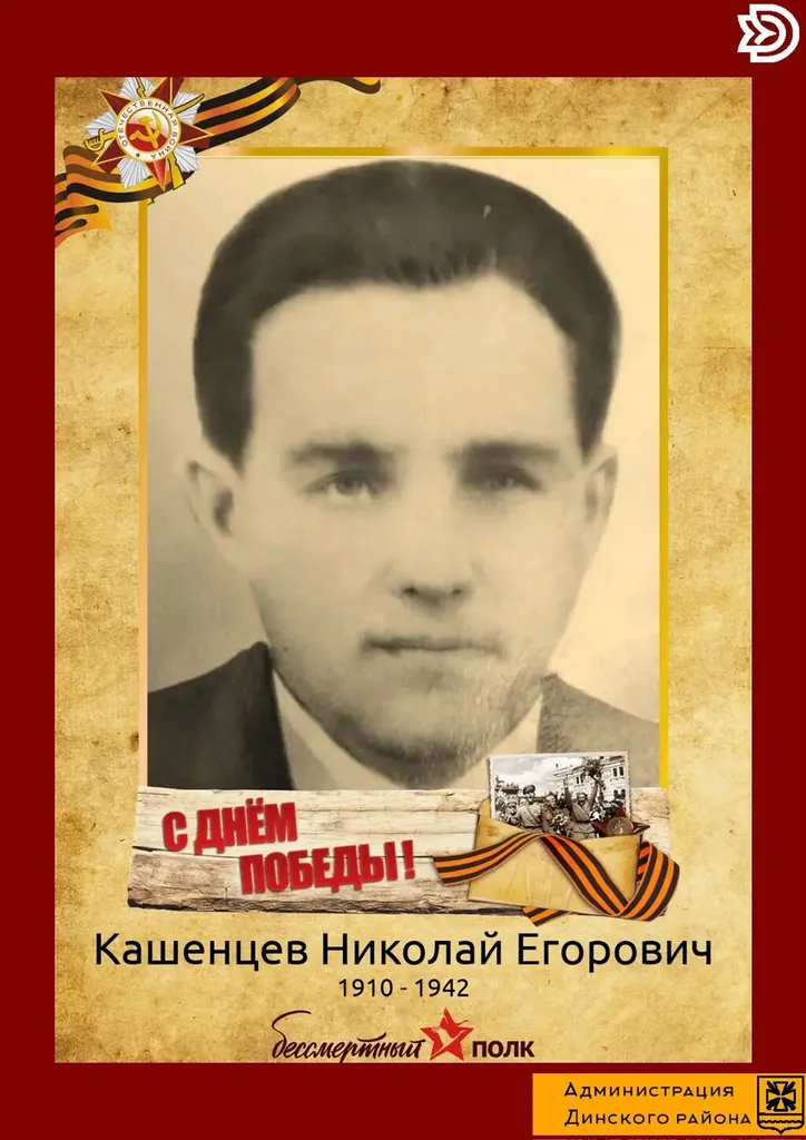 Мой прадедушка, Николай Егорович Кашенцев, родился в 1910 году в селе Дудина Гора Архангельской области. 24 июня 1941 года он отправился на фронт.